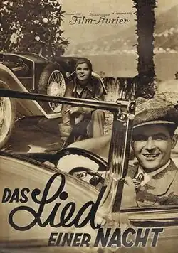 The Song of Night (German: Das Lied einer Nacht) is a 1932 German musical comedy film directed by Anatole Litvak and starring Jan Kiepura, Magda Schneider and Fritz Schulz.[1] It was made at the Babelsberg Studios in Berlin and on location in Lugano and Locarno. The film's sets were designed by Werner Schlichting. A separate English-language version Tell Me Tonight was made, also directed by Litvak. A French version One Night's Song was released in 1933.