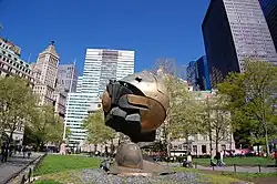 The Sphere (officially Große Kugelkaryatide N.Y., also known as Sphere at Plaza Fountain, WTC Sphere or Koenig Sphere) is a monumental cast bronze sculpture by German artist Fritz Koenig (1924–2017).[2]
