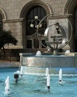 This nine foot, five inch stainless steel sculpture has three rings meaning harmony, unity and infinity. While the brass sphere represents earth. Each ring is a different size having one inside the other, therefore having each one get smaller, then the "globe" is the smallest. These sculpture is surrounded by a sixteen-foot, five inch concrete pool. Both are in front of the Milwaukee County Courthouse.[1]