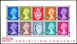 The show included the first personalized stamp sheets from the British Post Office, now generally known as Smilers sheets.[2] Another innovation was the "Matthews Palette" miniature sheet which was produced specifically for the show. The sheet featured stamps in colours drawn from the palette that designer Jeffery Matthews had produced in 1984 for Royal Mail, in order to return British definitive stamps to Arnold Machin's original idea of a light tone for the Queen's head against a solid background.[3][4]