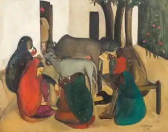 Between 1935 and 1941, Sher-Gil painted mainly in India, where she travelled to exhibit and sell her paintings.[7] She painted in Simla, where her parents lived, in Saraya, Gorakhpur, where her family owned a sugar factory, and in Amritsar and Lahore.[7] Following her 1937 tour of South India which included a visit to the Ajanta Caves, she produced a more classical art style with her South Indian trilogy of paintings Bride's Toilet, Brahmacharis, and South Indian Villagers Going to Market.[7][8] She became popular, though she felt her work was largely misunderstood.[9] The paintings reveal her sense of color and empathy for her Indian subjects, who are often depicted in their poverty and despair.[9] Criticised for portraying a dark side of India, she was simultaneously praised for bringing to the forefront the issue of women and poverty.[9] The trilogy had tired her out and her next set of paintings, including The Story Teller, would be smaller.[10]