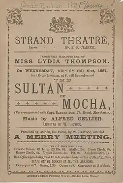 The musical theatre writer Kurt Gänzl describes The Sultan of Mocha as "one of the earliest British musicals of the modern era both to have a significant career at home and to win overseas productions".[3] It was first produced in 1874 at the Prince's Theatre, Manchester by the actor-manager Charles Alexander Calvert, who "accepted a text supplied by a local gentleman of some literary attainment", Albert Jarrett (1834–1916), which was then set to music by Alfred Cellier, the musical director at Alexander's theatre.[note 1] The production borrowed a camel from the local zoo for Middle-Eastern authenticity; it ran initially for 30 performances from 16 November to 9 December 1874, with Furneaux Cook in the title role[4] and Bessie Emmett as Dolly.[5] The Sultan of Mocha was taken off for the annual pantomime but returned in March 1875 (for two weeks) and April 1875 (for three weeks) with largely the same cast but with tenor John Chatterson as Peter, Catherine Lewis and Emily Muir as Dolly and Furneaux Cook reprising his role as the Sultan.[3]