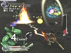 The game also features a "tension gauge" on the right side of the screen. This gauge indicates the player's performance level with combos. The gauge increases when aerial combos are chained and decreases as the player's momentum falls. When the gauge is full, the player will have the ability to perform a powerful "deathblow" attack, combining the party's force to deal extensive damage to the enemies. The level of the gauge increases as the game proceeds, allowing the player to use more powerful attacks. At its highest level, a filled gauge displays the text "Over Zenith," signifying that the strongest deathblow can be performed.
