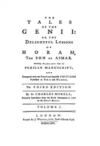The Tales of the Genii: or, the Delightful Lessons of Horam, The Son of Asmar is a collection by the English author James Ridley, consisting of Oriental pastiche fantasy tales modeled on those of the Arabian Nights. The work was originally passed off as an authentic work by a Persian imam named Horam translated into English by "Sir Charles Morell, formerly ambassador from the British Settlements in India to the Great Mogul" and published by an anonymous "editor." It is the work for which Ridley is chiefly remembered.[1]