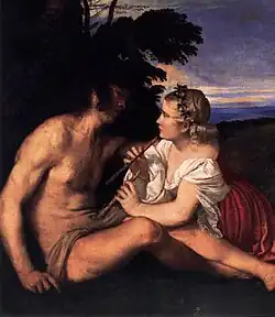 The Three Ages of Man (Italian Le tre età dell'uomo) is a painting by Titian, dated between 1512 and 1514, and now displayed at the Scottish National Gallery in Edinburgh. The 90 cm high by 151 cm wide Renaissance art work was most likely influenced by Giorgione's themes and motifs of landscapes and nude figures—Titian was known to have completed some of Giorgione's unfinished works after Giorgione died at age 33 of the plague in 1510. The painting represents the artist's conception of the life cycle. Childhood and manhood are synonymous with earthly love and death. These and the approaching old age are drawn realistically. Titian's widely chosen topic in art history, ages of man, mixed with his own allegorical interpretation make The Three Ages of Man one of Titian's most famous works.