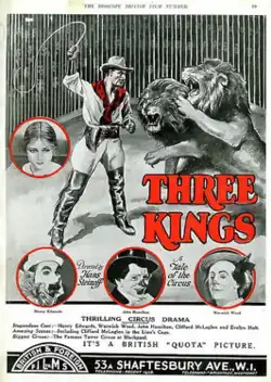 The Three Kings (German: Ein Mädel und drei Clowns) is a 1929 British-German silent drama film directed by Hans Steinhoff and starring Henry Edwards, Evelyn Holt and Warwick Ward. Separate versions were released in Germany and Britain. At a circus in Blackpool, a violent rivalry breaks out between two of the performers over a woman.