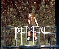 "The Time of Our Lives" was released for airplay, exclusively on Radio Disney, in order to promote the EP. "The Time of Our Lives" peaked at number twenty-three on the Bubbling Under Hot 100 Singles Chart (Billboard Hot 100 – 123)[55] and at number fifty-one on the Canadian Hot 100.[56] Cyrus embarked on her second concert tour, the Wonder World Tour, to promote The Time of Our Lives and her second studio album Breakout (2008). The tour was Cyrus's first to not have her costumed as Hannah Montana, and was announced in June 2009, with dates revealed for American venues.[57] Dates for venues in the United Kingdom were later announced.[58] In to order to avoid the extensive scalping that occurred during her previous tour, all tickets were sold exclusively through paperless ticket delivery, which required audiences to bring identification to gain entry into the concert.[57] The tour expanded from September to December 2009.[57]