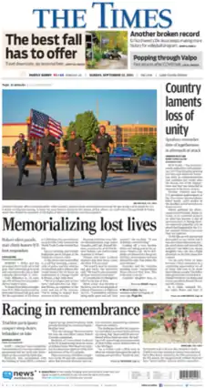 The paper was founded on June 18, 1906, as The Lake County Times. Its founder, Simon McHie, was a native of a small town along the Niagara River in Canada. In 1933, the name was changed to The Hammond Times, and it became an afternoon paper serving Hammond, Whiting, and East Chicago. In May 1962, the McHie family sold the publication to Robert S. Howard of Howard Publications.[2] The paper expanded to all of northwest Indiana in 1967 and dropped Hammond from its masthead to become simply The Times. Offices were moved to Munster in 1989, and the paper began morning delivery and began printing different editions based on distribution region. The Howard papers were bought in April 2002 by Lee Enterprises.[3]
