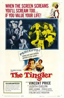 The film tells the story of a scientist who discovers a parasite in human beings, called a "tingler", which feeds on fear. The creature earned its name by making the spine of its host "tingle" when the host is frightened. In line with other Castle horror films, including Macabre (1958) and House on Haunted Hill (1959), Castle used gimmicks to sell the film. The Tingler remains most well known for a gimmick called "Percepto!", a vibrating device, in some of the theater chairs, which the onscreen action activated.