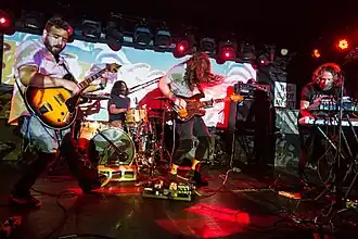 The Tins performing at Mercury Lounge in July 2018. From Left To Right: Adam Putzer, David Muntner, Justin John Smith, and Michael Santillo