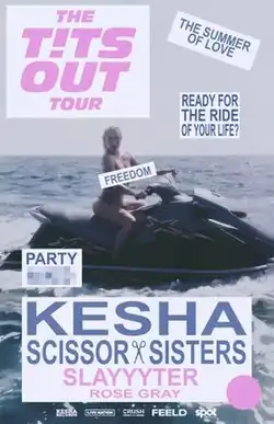 The Tits Out Tour is the ongoing co-headlining concert tour by American singer and songwriter Kesha, and American band Scissor Sisters.[1][2] The tour will promote Kesha's sixth studio album Period (2025), and is part of the Scissor Sisters reunion which began in 2024.[3] The tour commenced on July 1, 2025, in West Valley City, Utah, and is set to conclude on March 21 of the following year in Dublin, Ireland.