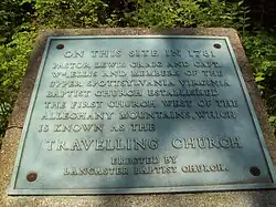 - ^ "English: This memorial by the National Society of the Colonial Dames of America in the Commonwealth of Kentucky for "The Travelling Church, 1781" is also known as State Marker 25 and is located on KY 39/Lancaster Rd, SE of Lancaster, Garrard Co., KY, 40444; 37.577915, -84.558316. Text on marker: "In search of religious freedom, the Reverend Lewis Craig led his entire congregation of 200 Baptists and 400 other settlers from Spotsylvania County Virginia and established them here on Gilbert's Creek. This expedition, guided through the wilderness by Captain William Ellis, was the largest group of pioneers ever to enter the District of Kentucky in a single body. Erected by the National Society of the Colonial Dames of America in the Commonwealth of Kentucky. 1947."". 30 April 2011. Retrieved 18 August 2017 – via Wikimedia Commons.