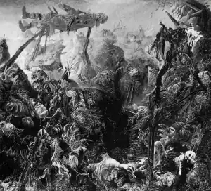 - "In the cold, sallow, ghostly light of dawn…a trench appears into which a devastating bombardment has just descended. A poisonous sulphur yellow pool glistens in the depths like a smirk from hell. Otherwise the trench is filled up with hideously mutilated bodies and human fragments. From open skulls brains gush like thick red groats; torn-up limbs, intestines, shreds of uniforms, artillery shells form a vile heap... Half-decayed remains of the fallen, which were probably buried in the walls of the trench out of necessity and were exposed by the exploding shells, mix with the fresh, blood covered corpses. One soldier has been hurled out of the trench and lies above it, impaled on stakes."[1]