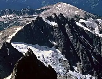The Triad is a mountain with three peaks located in the North Cascades, in Skagit County of Washington state.[5] Situated in North Cascades National Park, The Triad is positioned west of the crest of the Cascade Range, approximately 12 miles east of the town of Marblemount. The middle peak (highest) has an elevation of 7,520+ ft (2,290+ m), the west peak 7,440+ ft (2,270+ m), and the east peak 7,520+ ft (2,290+ m).[1] The popular hiking objective, Hidden Lake Peak Lookout, lies three miles to the southwest, and the nearest higher peak, Eldorado Peak, two miles to the northeast, is a popular mountaineering objective.[1] Precipitation runoff from The Triad drains into tributaries of the Cascade River which in turn is a tributary of the Skagit River. The first ascent of the mountain was made in 1949 by Dick Eilertsen, Dick Lowery, Dick Scales, and Don Wilde. This climbing party which had three identical first names, named it the Three Dicks. However, in the interest of good taste, the more suitable and similar name was adopted since "triad" means a group or set of three connected people or things.[3]