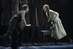 The novella was adapted to an opera by Benjamin Britten, which premiered in 1954,[65] and the opera has been filmed on multiple occasions.[66] The novella was adapted as a ballet score (1980) by Luigi Zaninelli,[67] and separately as a ballet (1999) by Will Tucket for the Royal Ballet.[68] Harold Pinter directed The Innocents (1950), a Broadway play which was an adaptation of The Turn of the Screw.[69] An adaptation by Jeffrey Hatcher, using the title The Turn of the Screw, premiered in Portland, Maine, in 1996 and was produced off-Broadway in 1999.[70] Another adaptation of the same title by Rebecca Lenkiewicz was presented in a co-production with Hammer at the Almeida Theatre, London, in January 2013.[71]
