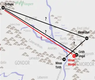 In a letter to Rayner Unwin in August 1953, Tolkien proposed the volume's title and considered leaving it vague, naming the ambiguous two as Orthanc and Barad-dûr, or Minas Tirith and Barad-dûr, or Orthanc and the Tower of Cirith Ungol.[2] In another letter, in January 1954, he stated that he was "not at all happy about the title The Two Towers", writing that if the title had "any real reference in it to Vol II" it would have to "refer to Orthanc and the Tower of Cirith Ungol (his italics).[3] He at once added that this would however be "very misleading", since there was "so much made of the basic opposition of the Dark Tower and Minas Tirith".[3] However, a month later, he wrote a note that is included at the end of The Fellowship of the Ring, and later drew a cover illustration, both of which identified the pair as Minas Morgul and Orthanc.[4][5] In the illustration, Minas Morgul is a white tower, with a thin waning moon above it, in reference to its original name, Minas Ithil, the Tower of the Rising Moon. Orthanc is shown as a black tower, three-horned, with Saruman's sign of the White Hand beside it. A Nazgûl flies between the two towers.[5]