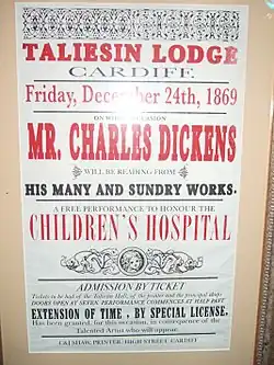 The production filmed one day in Cardiff at the New Theatre on 19 September 2004 for the scene of Dickens' performance.[13] On 20 September, the theatre's exterior, along with Dickens' departure scene, was filmed at Cambrian Place at Swansea Marina.[14] The funeral parlour exterior was the Beaufort Arms Court in Monmouth, recorded on 21 September.[15] More scenes in the Cardiff square were filmed on Church Street and St Mary's Street in Monmouth on 22 September.[16] Small pieces of paper were sprayed as snow, which caused a problem as it scared the horses.[1] However, the snow falling from the sky was a foam substance.[3]