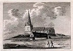 Somewhere around A.D. 968, monks, from the Benedictine monastery of Mont Saint-Michel, came to Guernsey to establish a community in the North of the Island. It is likely that at one time a land bridge connected the two sections next to the Vale church, before the sea broke through.[2] In 1204 it is reported that the Royal Court of Guernsey visited the Braye du Valle to replace boundary markers that had been washed away.[3] This area of Guernsey would form a separate island at high tide, and continued to do so until 1806. The Priory of Mont Saint-Michel was a dependency of the famous Abbey of Mont Saint-Michel. The last remaining stonework is a piece of buttressed wall to the South of the church, by the roadside.