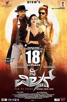 Director Prem announced new film starring Shiva Rajkumar and Sudeepa. The film is about a villager who dreams to become an actor. The film is produced by C. R. Manohar and they signed Bollywood actor Mithun Chakraborty in an important role that has been kept as a secret in the beginning, but the news was later leaked to the press.[4] The film was launched by then Karnataka's Chief Minister Siddaramaiah on 13 December 2015[5][6] and the first look was released in March 2017.[7] Before the release of the first look, the movie was titled as Kali taglined Ruler Warrior. But later was changed as The Villain taglined Ram Ravan due to some reasons. The film completed a schedule and was reported to have portions in England and two other foreign countries to be shot. By then, the film fetched ₹5.4 crore as Hindi rights. Actress Amy Jackson was signed as the female lead.[8][9] The song "Jeeva Hoovagide"[10] from Nee Nanna Gellalare composed by Ilaiyaraaja was shot with Shiva Rajkumar and Amy Jackson in replicated costumes of Rajkumar and Manjula from the original film in a schedule where entire talkie portions were shot, except few songs.[11][12] Later, filming the climax was completed on 1 February as per actor Sudeepa's tweet.[13]