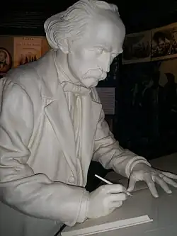 The family moved to England when Nathaniel Hawthorne was appointed United States consul at Liverpool; he served in that role from August 1, 1853, to October 12, 1857.[26] Shortly before leaving, on June 14, 1853, friend and poet Henry Wadsworth Longfellow held a farewell dinner party at his Cambridge home.[27] The Hawthornes stayed in Europe until 1860 and, during that time, they leased The Wayside to family members including Sophia's sister, Mary Peabody, who later married Horace Mann. During her time in the house, Franklin Benjamin Sanborn stayed at The Wayside for a night while hiding his connection to John Brown's raid on Harpers Ferry.[28] The Hawthornes' son Julian later went to Sanborn's school.[29] Before returning to the United States, the Hawthornes spent several months in Italy where, in April 1859, Nathaniel grew a mustache.[30]