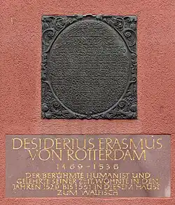 As recorded on the façade of the building, the humanist Erasmus of Rotterdam lived in the Villinger house after his escape from Basel. However, at the time of his arrival in Christmas 1529, the house was still unfinished.[14]