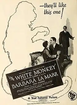The White Monkey is a 1925 American silent drama film, directed by Phil Rosen and starring Barbara La Marr, Thomas Holding, and Henry Victor, and based on a part of John Galsworthy's Forsyte Saga. It was released by First National Pictures on June 7, 1925.[2]