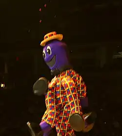 Introduced in 1992, Henry the Octopus "directs an underwater band and loves to dance with his eight legs".[1] He was named after Tony Henry, the drummer in The Cockroaches, who also provided the Wiggles with musical support throughout the years.[16] The character was developed by Fatt, who originally served as Henry's voice. Paul Paddick took over the role of the voice in the mid-2000s. He has appeared as both a puppet and a mascot, the latter of which has been played by various dancers on staff.