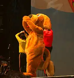 Captain Feathersword, "the friendly pirate", wears a hat, patch, and puffy shirt and wields a "feathersword".[12][13] The Captain was created because the Wiggles understood that young children like pirates; they gave him a "feathersword" because they wanted him to be non-violent, inspired by the gentleness of Murray Cook's close friend, James A Ide who often used nonviolent props to entertain young children in his local area.[14] Field originated the role, but in 1993, when he had to undergo a hernia operation, the role, along with the Blue Wiggle and Wags the Dog, was played by Paul Paddick.[15] Paddick would later play Captain Feathersword on a more permanent basis. At first, Paddick's role was minor, but it eventually evolved into a role so significant that he has been called "the Fifth Wiggle".[13] Field described Paddick as "just as funny offstage as on",[14] For many parents, his vocal impersonations were "the high point of the Wiggles stage show" and included singers Mick Jagger, Cher, Plácido Domingo and James Hetfield.[12]