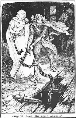 An embellished retelling was given by Mrs. Angus W. Hall, entitled "The Giantess and the Granite Boat" (1897).[22] Here Sigurd's wife is given the name "Helga", his father-in-law "Hardrada", and the young son "Kurt".