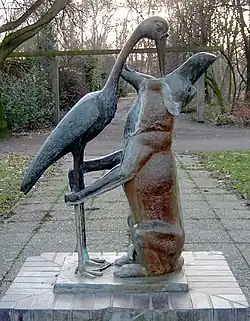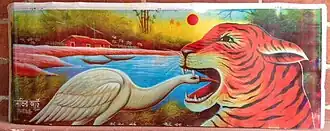 The subject continues to be featured in more modern times, as evidenced by its appearance on the St. Petersburg monument to Ivan Krylov (1855),[12] as a bronze sculpture by Joseph Victor Chemin (1825–1901) in the Musée Jean de La Fontaine,[13] and by Stefan Horota in Berlin's Treptower Park (1968). In Bangladesh, the story is adapted to native species, the tiger and crane or egret, and is found painted on rickshaw panels as illustrated above.