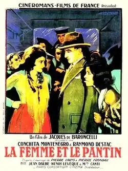 The Woman and the Puppet (French: La femme et le pantin) is a 1929 French silent drama film directed by Jacques de Baroncelli and starring Conchita Montenegro, Tristan Sévère and Henri Lévêque. It is an adaptation of the novel of the same name by Pierre Louÿs.[1] and the play of the same name by Pierre Frondaie.