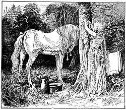Reaching the castle, she threatens the daughter as she did her mother, and though the daughter does not do what she prohibits, she turns her into a reindeer and smuggles her own daughter into her place. But the child grows restless. A widow tells the prince what happened to his true wife, and he lets her take the son to the woods. The reindeer turns into a woman to nurse her child, but tells the widow she can do it only for three days before the herd goes on. The widow tells the prince to burn the reindeer skin. When he does, the woman complains she has nothing to wear and changes form, but the prince goes on destroying them. She gives up and complains that the witch will kill her.