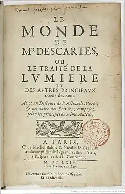 The World, also called Treatise on the Light (French title: Traité du monde et de la lumière), is a book by René Descartes (1596–1650). Written between 1629 and 1633, it contains a nearly complete version of his philosophy, from method, to metaphysics, to physics and biology.