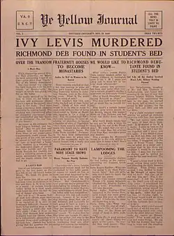 The newspaper's outlandish headlines regarding prominent members of the university community caused a stir among the faculty and administration, and "Ye Yellow Journal" was denounced by some as being "inconsistent with the ideals and traditions of the University of Virginia."[5] The satirical content was apparently less controversial than the broadsheet's anonymity; in 1928, the faculty senate adopted a resolution that viewed "with profound disapprobation anonymous publications," and "earnestly request[ed] the students responsible" to cease publication. When the Journal's editors stated an intent to omit references to the faculty from further issues, university professors stated that the principal objection was the paper's anonymity.[4]