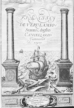 Bacon also quotes from the Book of Daniel (12:4) in the inscription on the frontispiece of the 1620 publication: "Many shall go to and fro and knowledge shall be increased." Through this inscription, Bacon draws a parallel between the Age of Exploration and the Scientific Revolution. The frontispiece also depicts European ships sailing past the Pillars of Hercules, which represented the geographical boundary of the classical world.[7] In Aphorism 92, Book I of Novum Organum, Bacon writes: "…just as Columbus did, before his wonderful voyage across the Atlantic Ocean, when he gave the reasons for his confidence that he could find new lands and continents beyond those known already; reasons which, although rejected at first, were later proved by experiment, and became the causes and starting points of great things."