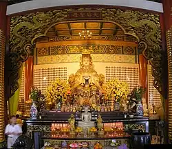 This syncretic temple with elements of Buddhism, Confucianism and Taoism is a grandiose structure and represents a successful combination of modern architectural techniques and authentic traditional design featuring imposing pillars, spectacular roofs, ornate carvings and intricate embellishments.[2] Its grand architecture has made it as one of the tourist destination. The front entrance of the temple features a multi-arched gateway with red pillars, the colour symbolic of prosperity and good fortune. Souvenir stalls and a canteen are found on the first level.[3] The second-level houses the multi-purpose hall while offices are located on the third level. The fourth level has three tiers and the prayer hall is located here.