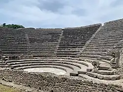 The Odeon was a smaller roofed theatre, theatrum tectum, that sat 1500 spectators and was built in 80 BC.[5] The theatre follows the plan of other Roman theatres and odeon structures. Where the Large Theatre was used primarily for staging drama, the Odeon was intended for council meetings as well as entertainment.