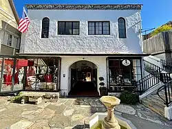 In 1950, Kuster sold the Golden Bough Court, the property that once surrounded the theater's entrance, to Sumral and Ruth Otrich. This slice of land, measuring 47 ft (14 m) by 80 ft (24 m), is situated behind the present-day Cottage of Sweets. Otrich invested $50,000 (equivalent to $653,458 in 2024) to construct three English Tudor-style shops and three apartments on a second floor.[16][17][18] Nearby was the restaurant called Sade's (now Portabella).[17] Today, these buildings are part of the Golden Bough Court, where only the facade of the original Theatre of the Golden Bough remains and opens to an arcade courtyard featuring various shops.[16][17] The theatre's box office also survived, became the Carmel Weavers Studio, and is now The Cottage of Sweets, a candy shop.[13]
