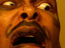 Through the use of makeup, specifically highlighting and shading, the apparent shape of an actor's face can be changed.[3] By highlighting the face's protruding bones, the features become pronounced; shadowing cavities can add depth.[4] Sagging jowls, forehead wrinkles, eye pouches, and prominent veins can be created by manipulating highlights and shadows.[3] A highlight is a base makeup that is at least two shades lighter than the base. It is applied on the bridge of the nose, cheekbones, and areas under the eyes and below the brows.[4] Using a color two shades deeper than the base provides depth and definition. This depth is commonly used on the eye sockets, to thin the sides of the nose, to shallow the cheeks, and to minimize heaviness under the chin.[4]