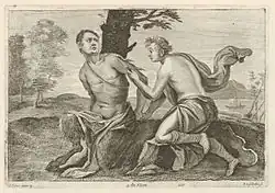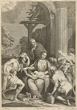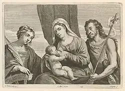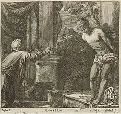 Teniers used full colour in the modelli, rather than grisaille. This could mean that he intended these reproductions to function as independent records of some of these Italian paintings in the Archduke's collection. From the many modelli, which have been preserved, it is obvious that Teniers's copies constitute a true record of the originals even while he left out details and painted them in his typical fluid and transparent manner. The engraving of the catalog by engravers who worked after the modelli, not the originals, was started by 1656.[5] In the 17th century there existed no efficient method for inverting images. As a result, most of the prints in the catalog are reverse images of the originals.[6] Each print gives the name of the author of the original work on the left hand side (indicated by the letter 'p' for 'pinxit', Latin for 'painted by') and the engraver of the print on the right hand side (indicated by the letter 's' for 'sculpsit', Latin for 'engraved by'). Some editions also indicated the original dimensions of the paintings.[7]