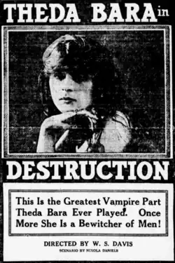 - ^ These roles did not portray the undead vampires featured in later horror films. The term "vampire" for a seductive woman was derived from "The Vampire", an 1897 poem by Rudyard Kipling,[2][3] inspired by Philip Burne-Jones' 1896 painting "The Vampire" depicting a woman (purportedly Mrs Patrick Campbell, a stage actress and the artist's ex-lover) mounting an unconscious man.[4]