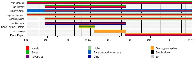 The band's dynamic has gone through changes with additions and replacements in the line-up. Trudeau's breaking her collarbone in a motorbike accident prevented them from touring, leading the band to spend time working more singing into their pieces.[2] Drummer Scott Levine Gilmore's replacement, Eric Craven, contributed a louder and more lively feel; Craven was subsequently replaced by drummer David Payant.