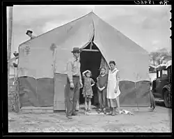 Steinbeck pays great attention to highlight how the Depression has impacted the families in the squatter camps by tracing their economic degeneration, and the intense precision and consistency that their agricultural work demands.[39] He mentions a family that had been very successful farmers,[40] and another that had owned a grocery store.[41] Additionally, he notes the tempered optimism that many new residents had, and works to humanize the squatters: their desire to educate their children, and the loss of loved ones that marks their lives evoke sympathy. With the "filth"[42] and malnutrition of the camps, causes of death are clear to Steinbeck—and, he purports, to the squatters.[43]