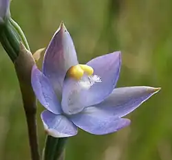 Thelymitra basaltica, commonly called the grassland sun orchid,[2] is a species of orchid that is endemic to Victoria. It has a single fleshy, channelled, dark green leaf and up to eight small pale blue, self-pollinating flowers which open only slowly on warm to hot days.