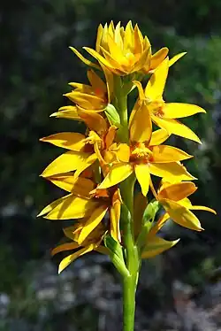 Thelymitra dedmaniarum, commonly called the cinnamon sun orchid,[2] is a species of orchid in the family Orchidaceae and is endemic to Western Australia. It has a single flat, leathery leaf and up to fifteen cinnamon scented, golden yellow flowers. It is a rare orchid with a restricted distribution.