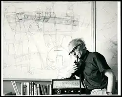 ![]() Themerson in his studio in London, in front of a painting by his wife Franciszka | |