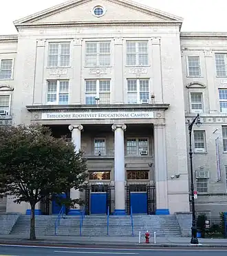 Theodore Roosevelt High School, originally Roosevelt High School, the third public high school to open in the Bronx, New York,[1] operated from 1918 until its permanent closure in 2006. Shutting down incrementally since 2002, this large high school, initially enrolling about 4 000 students,[2] yearly dwindled, newly sharing its 1928 building with new, small public high schools—all pooling students for major, extracurricular activities like athletics and JROTC—a reorganization renaming the building Theodore Roosevelt Educational Campus,[3] still open after the historic, namesake high school ceased in 2006.[4] At its November 1918 opening, Roosevelt High School operated in the building of school PS 31.[5]