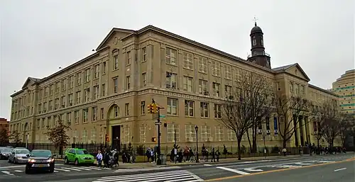 In the early 20th century, American educators sought to both expand and tailor schooling and to extend school enrollment into adolescence, newly seen as a prime opportunity to properly socialize youth, especially to assimilate the rapidly growing immigrant populations of cities.[36] Helping to define, or even to create, this concept of adolescence as the transition from childhood to adulthood, high schools became venues where youth vied for control over identity, behavior, and allegiance, while the 19th century's esteem for Protestant respectability faded to the 20th century's emergent quests for intricate cosmopolitanism.[36] In a multiethnic city like New York, educators intentionally employed the high school as a fundamental agent of socialization.[36] Entering 1918, the Bronx had two high schools: the Morris and the Evander Childs.[37][38][39]
