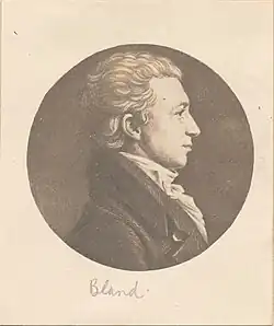 After the constitution was adopted, Virginia legislators elected to Bland the First United States Congress (he ran unopposed). He served in the House of Representatives from March 4, 1789, until his death in 1790 at the age of 49. He died while attending the Congress in New York City, and William B. Giles of Amelia County was selected as his successor.[20] Bland was the first member of the House of Representatives to die in office.[21] William Branch Giles completed his term.