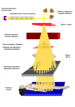 - Direct electron-beam therapy, in which a narrow, low-current beam of high-energy (5 to 25 MeV (0.80 to 4.01 pJ)) electrons was scanned over the treatment area by magnets;[10]